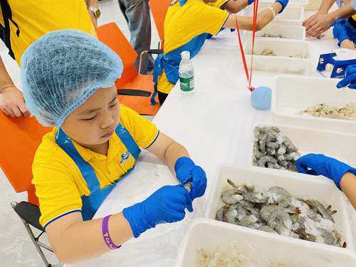 在一番参观后,迎来了本次活动的重点环节——剥虾微公益课堂,以“小朋友每剥好一条虾,国联水产集团便捐出1元”的方式,为大家的爱心买单。